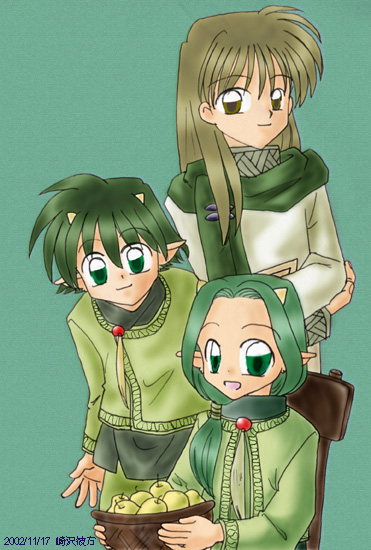 「折角だから背景も緑にしちゃえ♪と、くどくならない程度に緑で統一しました。」 だ、そうですよ。 あとから気がついたらしくて、ロイとノイ、この2人に関しては想像で色をつけたとか。 それにしても・・・どうして崎沢ははこうも口あけて笑ってる子の笑いが 思いきり怪しい笑いになってしまうのか・・・。 ・・・そんなつもりないらしいんですけど(下書きまではそうなってはいないのに) どうしても怪しい笑いに見えてしまうのは自分だけでしょうか? 強面だけど気のいいお兄さんのはずが・・・(汗) この服着てなかったら間違いなくカディオさんには見えないでしょうね・・・。 もっと幅広い年齢そう描けるようになってもらわないと。 ひみつフルーツにでてきたあの果物・・・の、つもりなんですって。 |