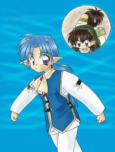 ソレらしく見えないよなこのイラスト・・・。 間違いなく背景が原因だぜ?(背景だけじゃないだろうけどさ、おそらくは) 出来あがって見ればイラストに付けたタイトルとは似ても似つかないバックの出来上がり・・・。その場のノリで背景を付けるからだよな。 「・・・ま、まぁ・・・いっか」って、よかねーだろ、をい。 ユイシィはきりっっとして ランバルスさんは、う〜んと頭ぽりぽりかいてて。 背景なかったらそれらしく見えたかもな(にやり)。 個人的には右上にいるちびユイシィとちびランバルスさんが 気に入ってたりするってさ。 |